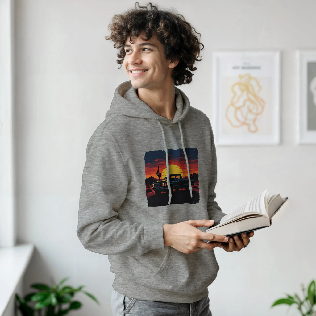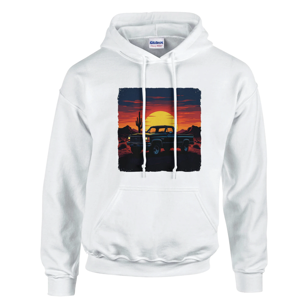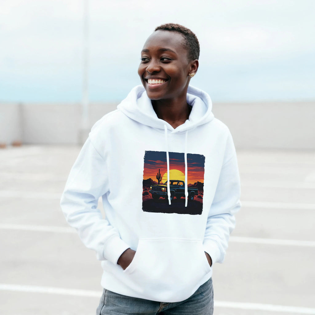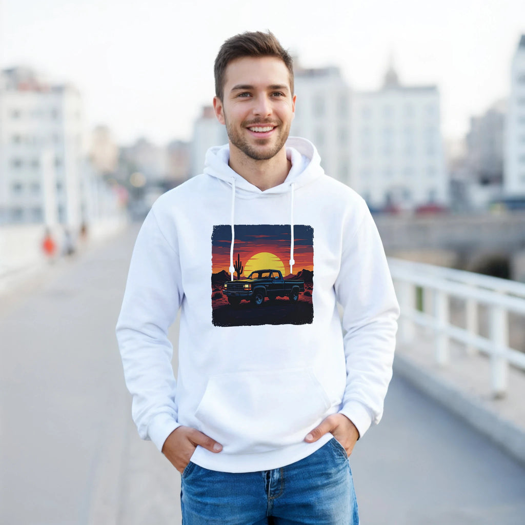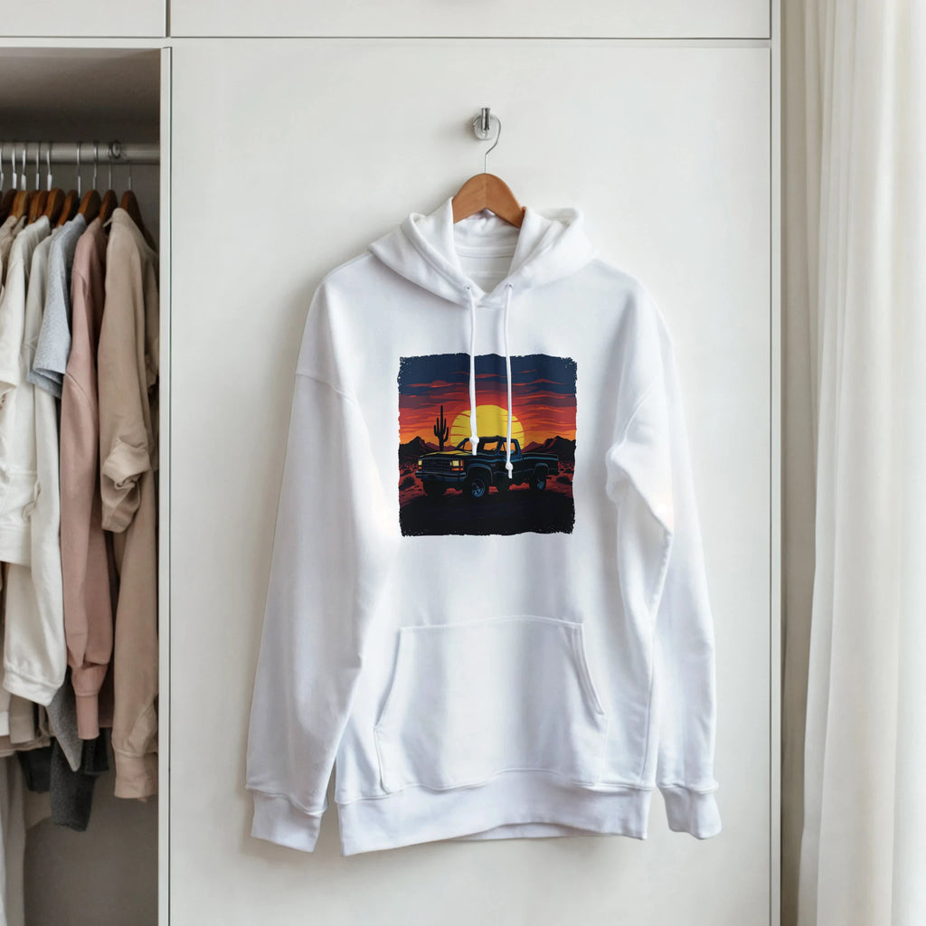 Embrace a nostalgic vibe with our Retro Monochrome Pickup Truck Hoodie, featuring a stunning line art illustration of a classic 1990s pickup parked in a desert during sunset. This design is ideal for those who love clean graphics and retro aesthetics.