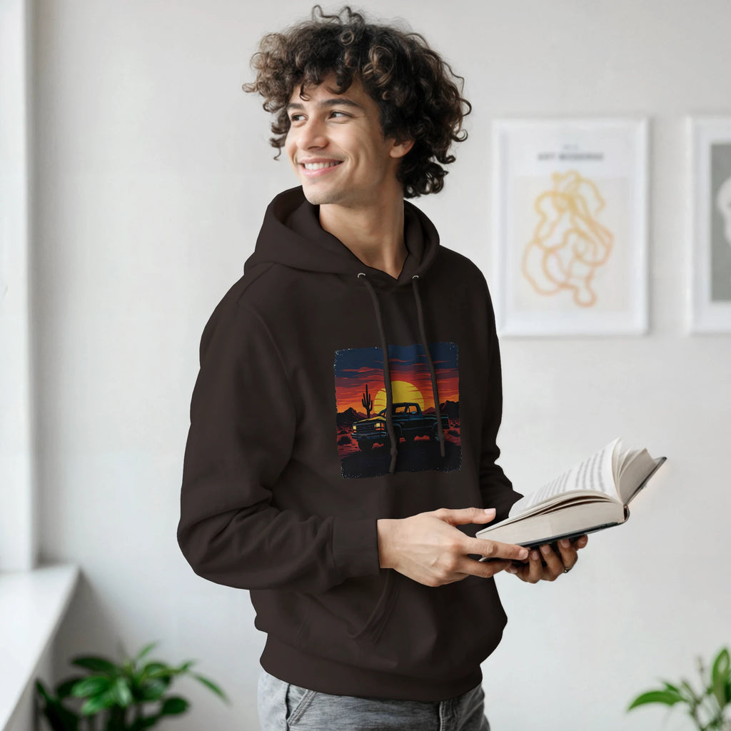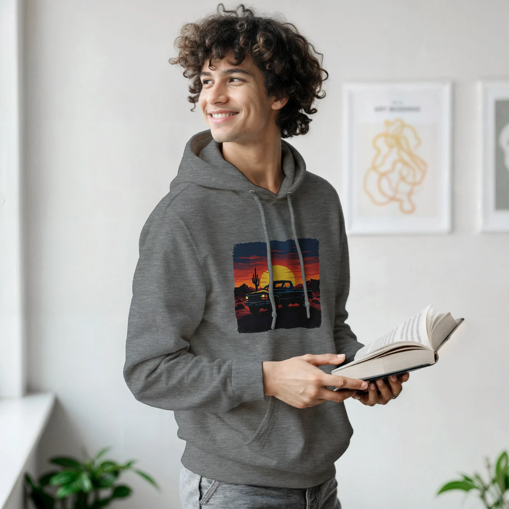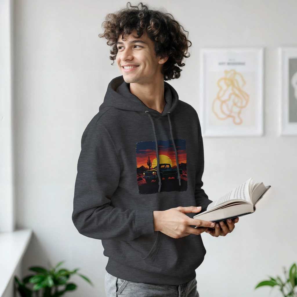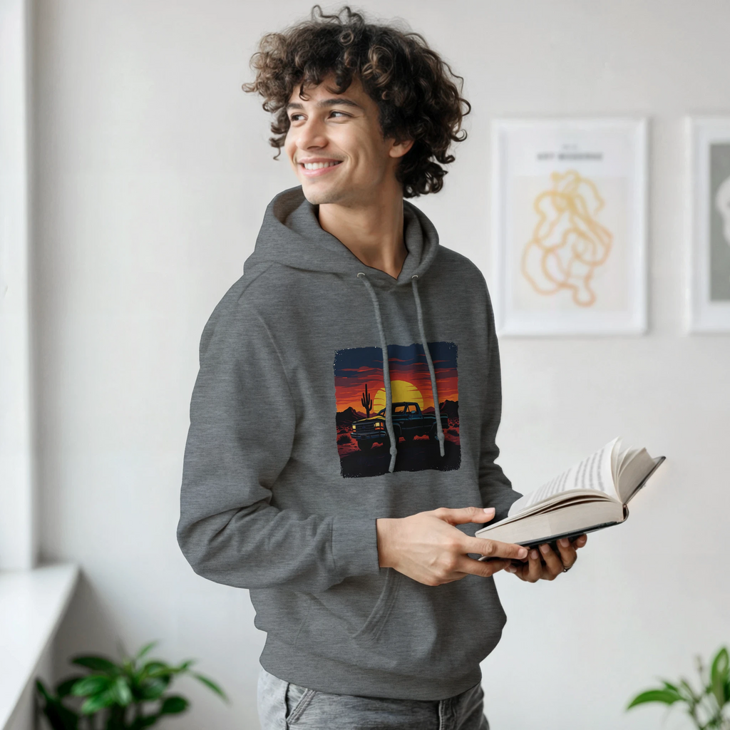 Embrace a nostalgic vibe with our Retro Monochrome Pickup Truck Hoodie, featuring a stunning line art illustration of a classic 1990s pickup parked in a desert during sunset. This design is ideal for those who love clean graphics and retro aesthetics.