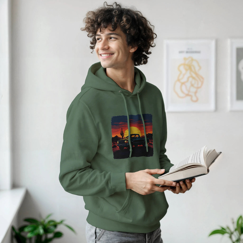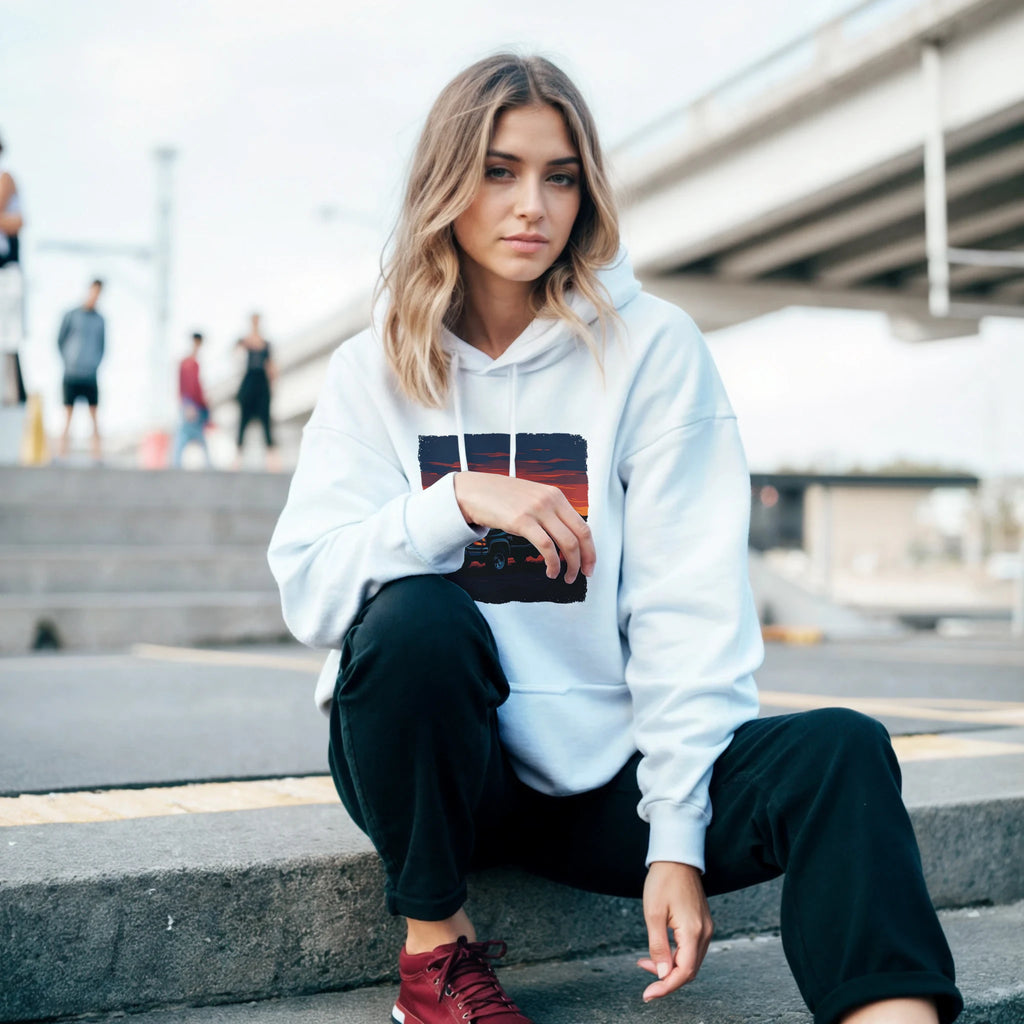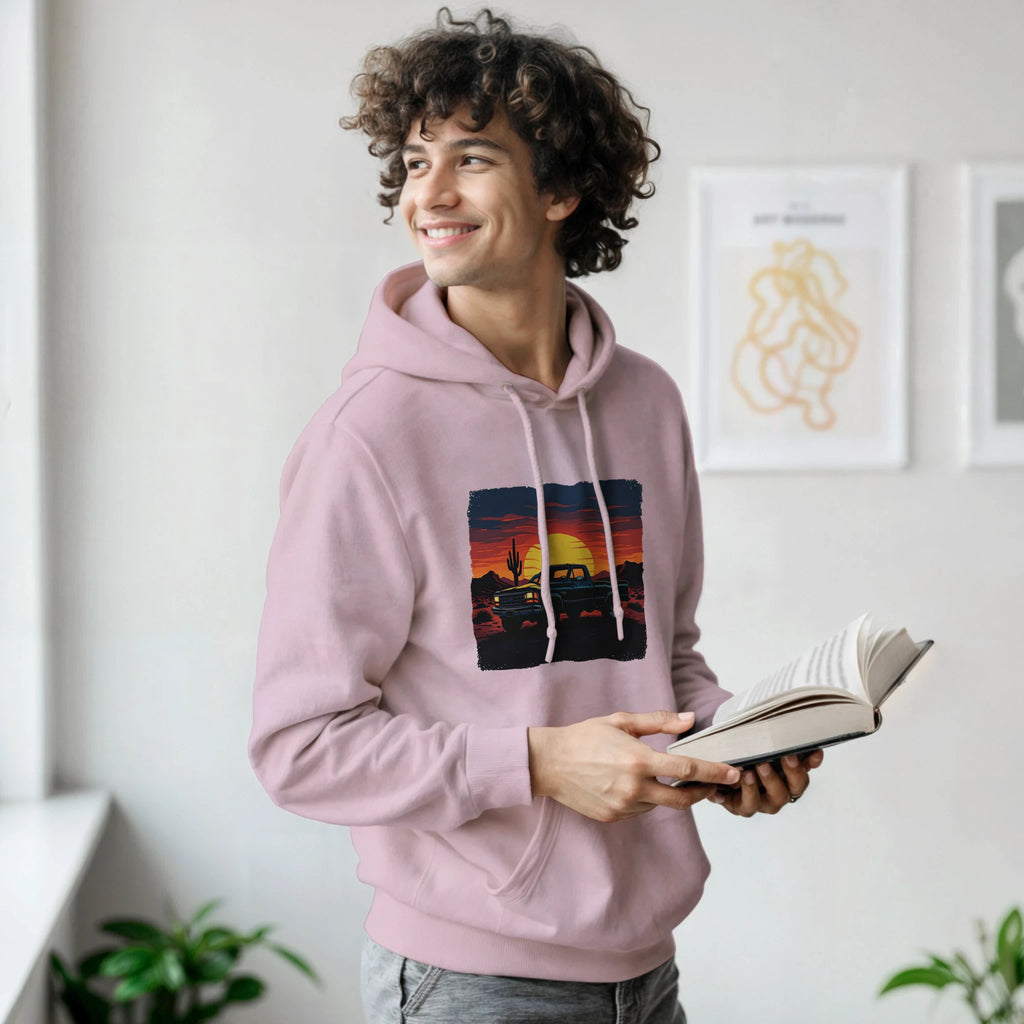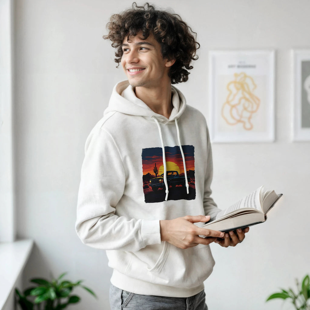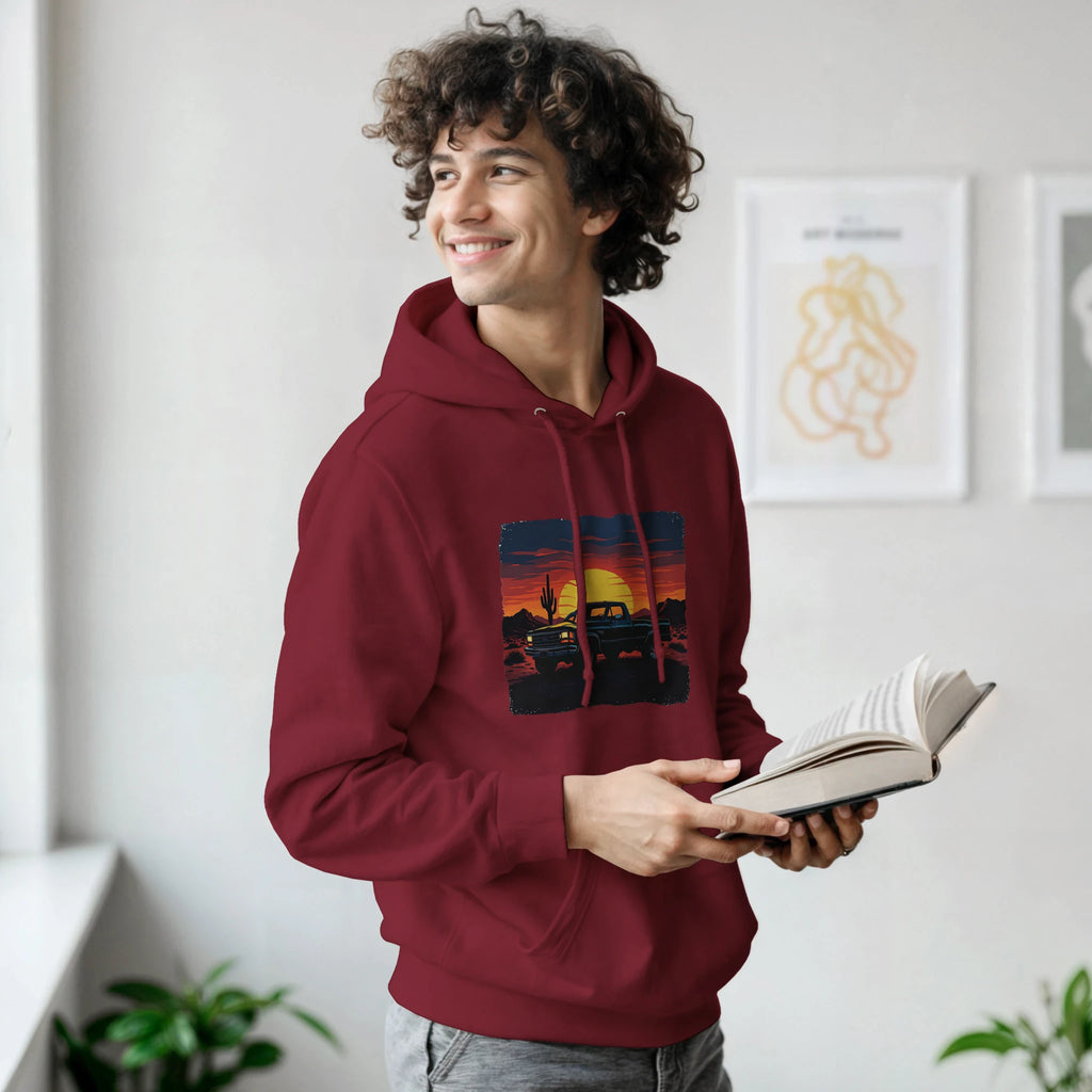 Embrace a nostalgic vibe with our Retro Monochrome Pickup Truck Hoodie, featuring a stunning line art illustration of a classic 1990s pickup parked in a desert during sunset. This design is ideal for those who love clean graphics and retro aesthetics.